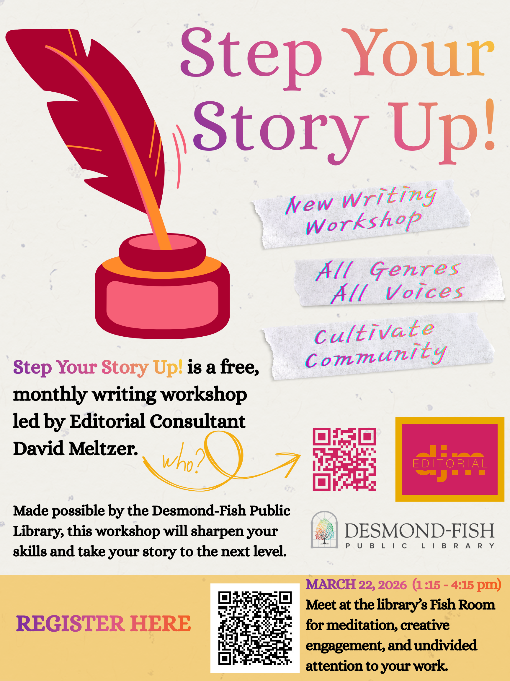 All writing shared on the registration form will be organized into a Reading Materials Packet which attendees will receive in advance of our workshop. Author names will be removed so we can focus on the writing. Submitting writing in advance is not required to attend the workshop.